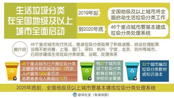 2019年起全国地级及以上城市将全面启动生活垃圾分类工作,到2020年底,46个重点城市要基本建成垃圾分类处理系统。2025年底前,全国地级及以上城市要基本建成垃圾分类处理系统。