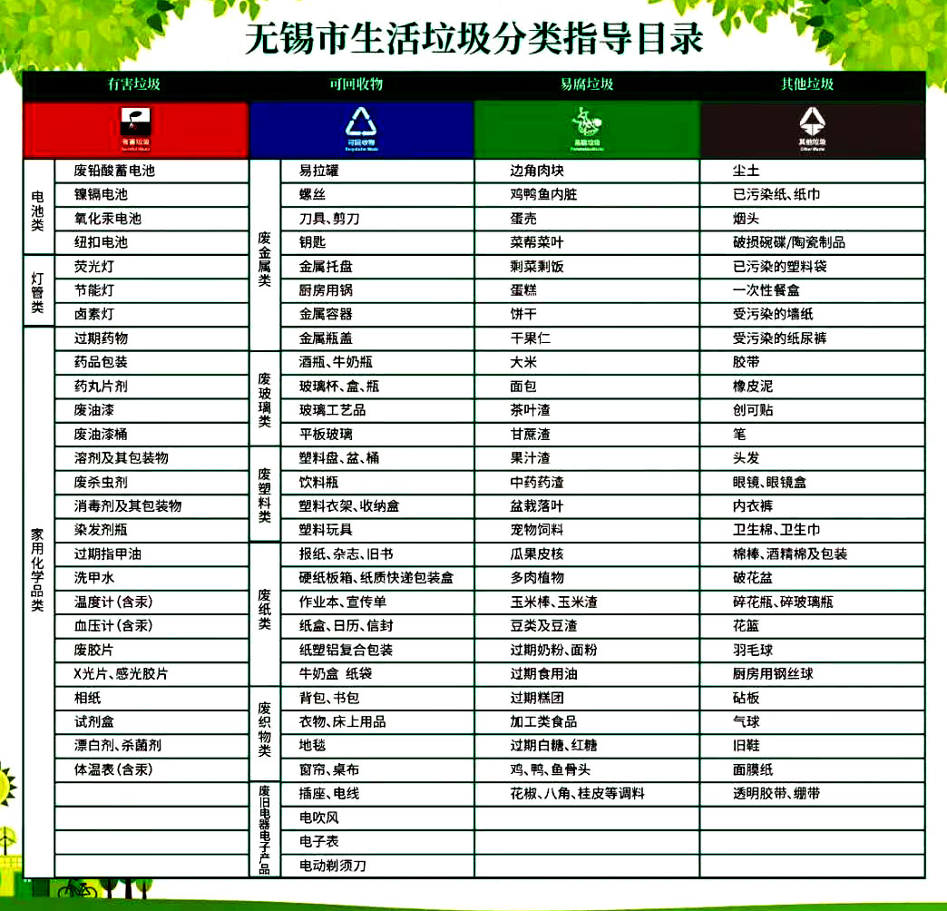 目录中对各类垃圾进行了细分,涵盖大部分日常生活中产生的垃圾。据了解,此次编制的《无锡市生活垃圾分类指导目录》是第一版指导目录,日后将根据垃圾分类工作的推进情况并结合市民的意见,逐步更新。